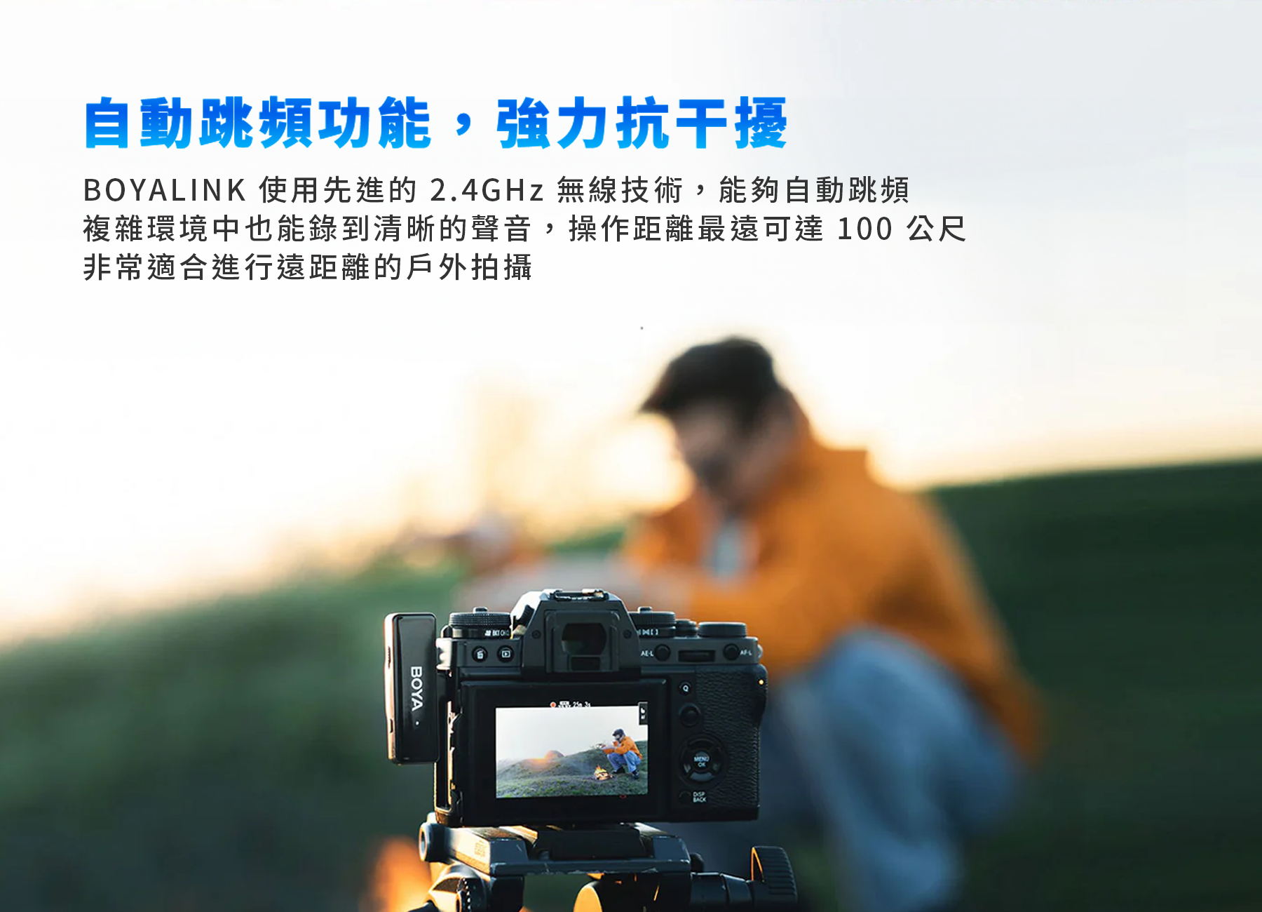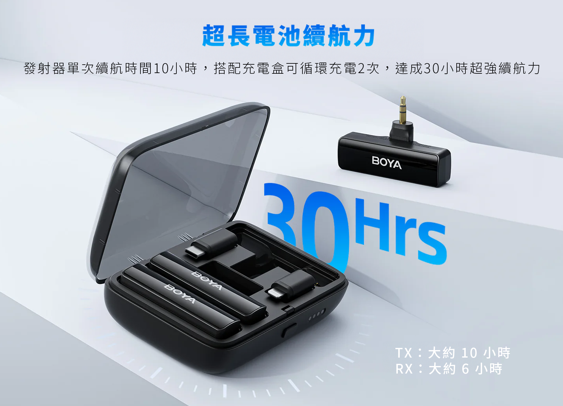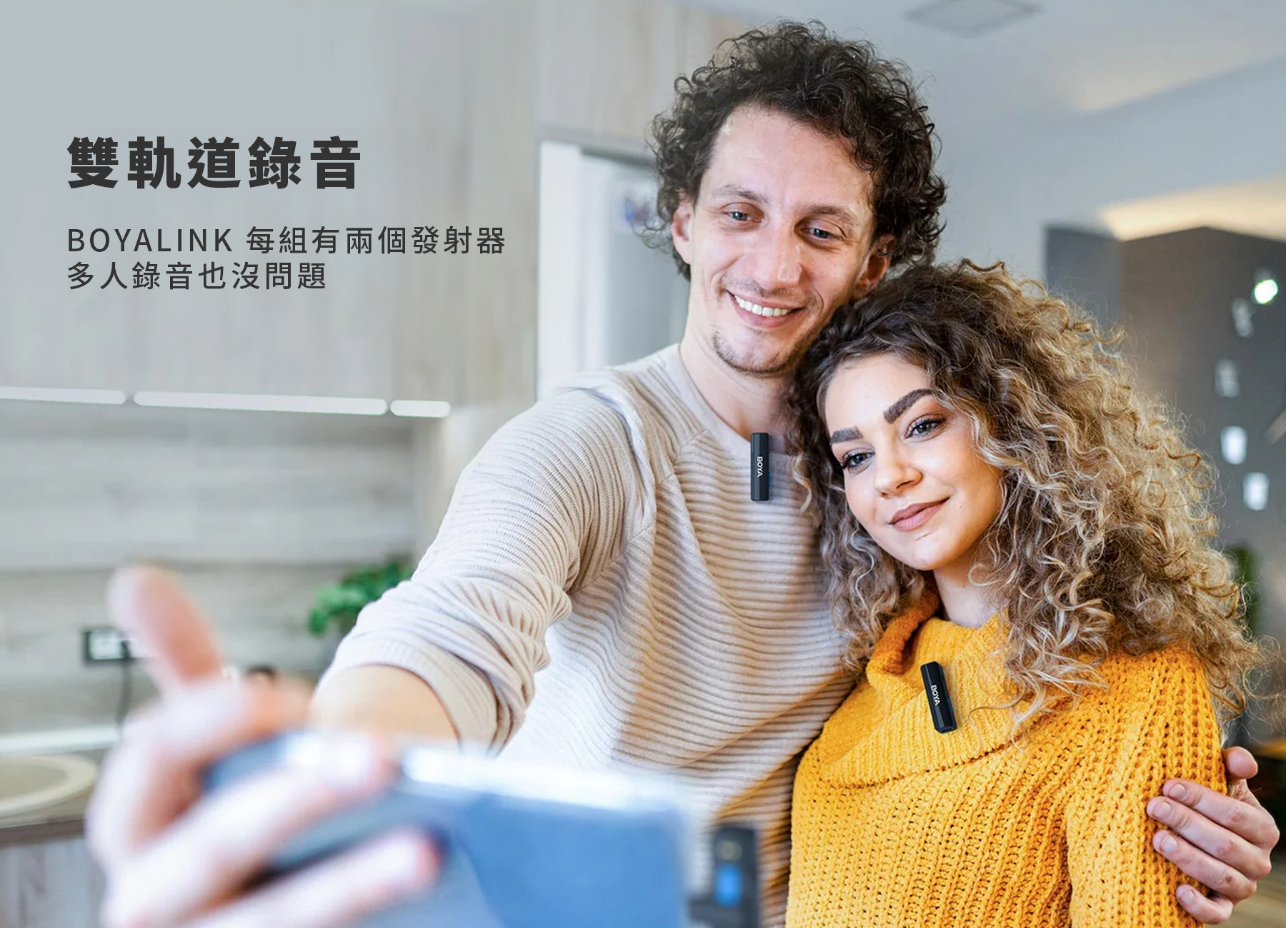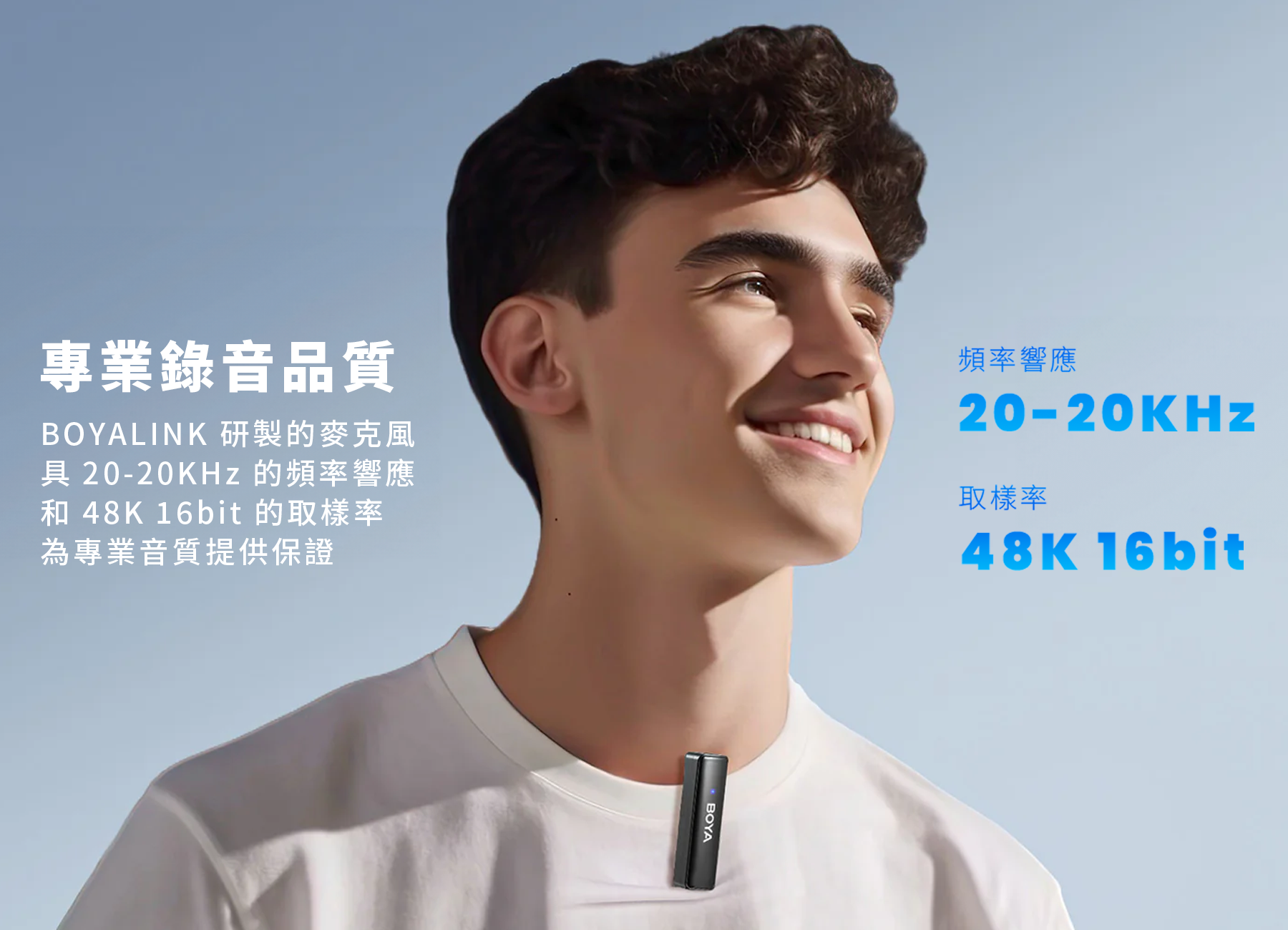 本款無線麥克風系統採用 2.4GHz 傳輸,支援雙發射器(TX)與單接收器(RX),操作距離最遠達 100 公尺,搭配 Type-C 充電盒可連續循環供電,是創作者、行動錄音、Vlog 與教學場景的絕佳選擇。