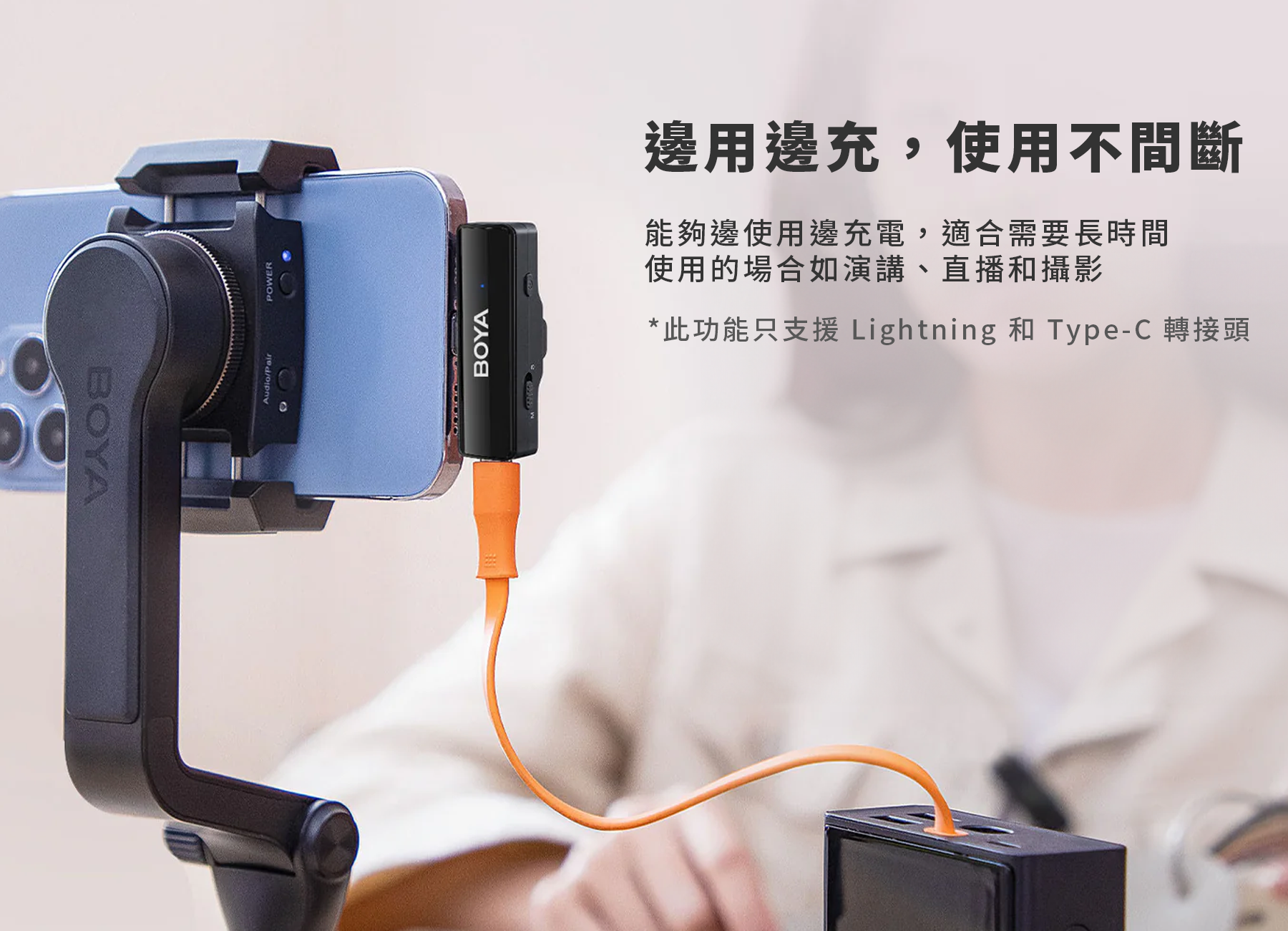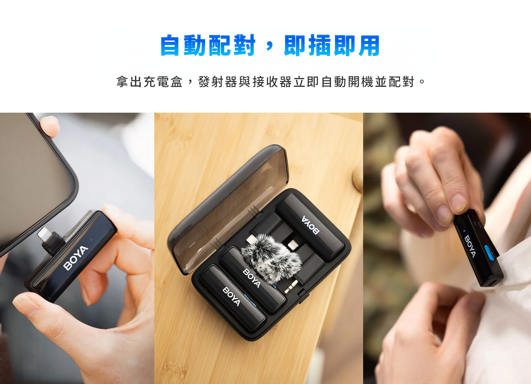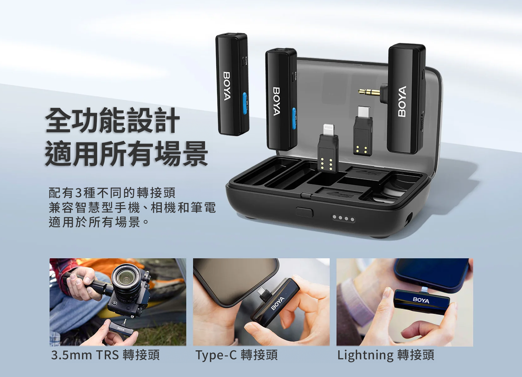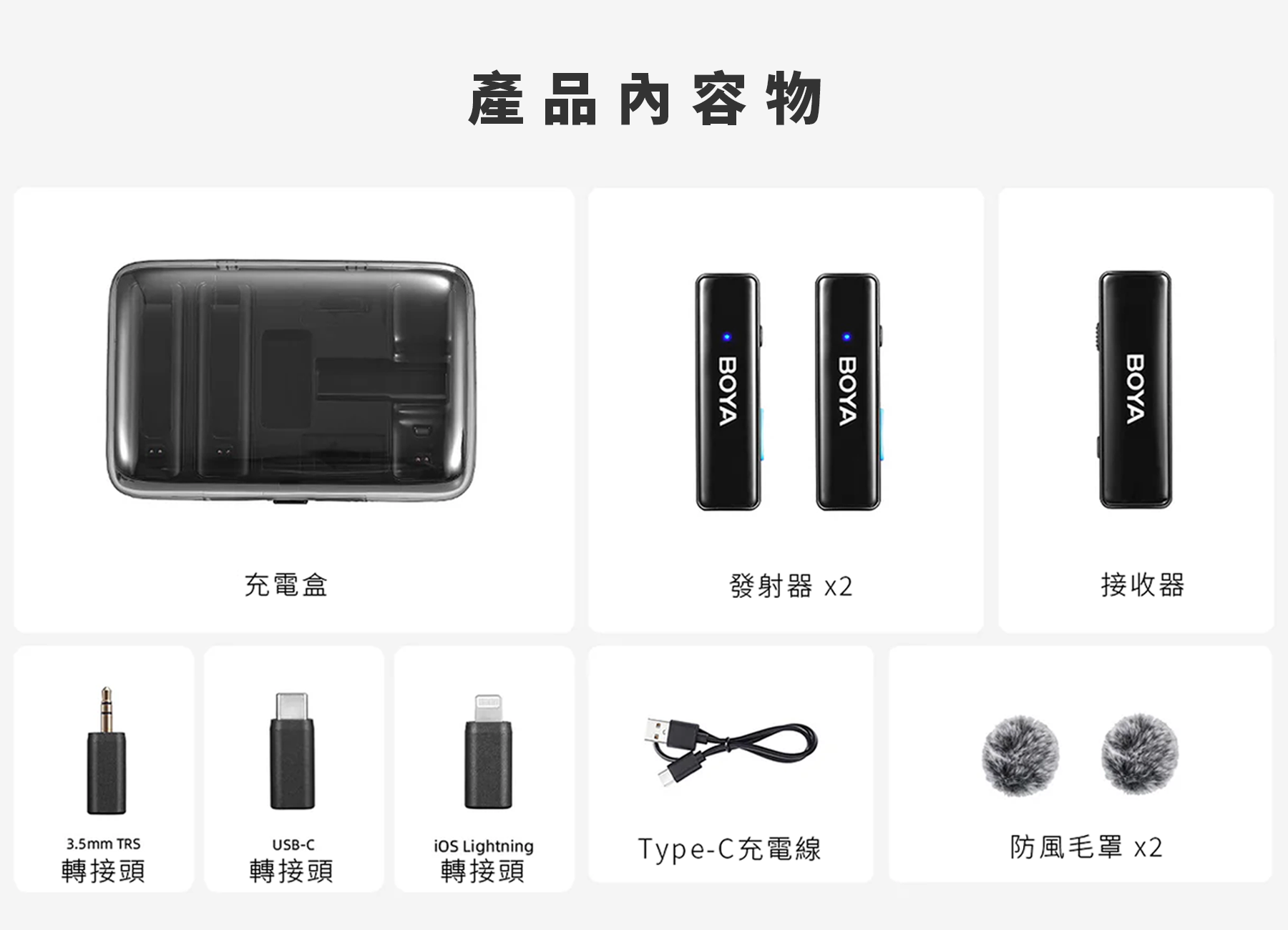 本款無線麥克風系統採用 2.4GHz 傳輸,支援雙發射器(TX)與單接收器(RX),操作距離最遠達 100 公尺,搭配 Type-C 充電盒可連續循環供電,是創作者、行動錄音、Vlog 與教學場景的絕佳選擇。