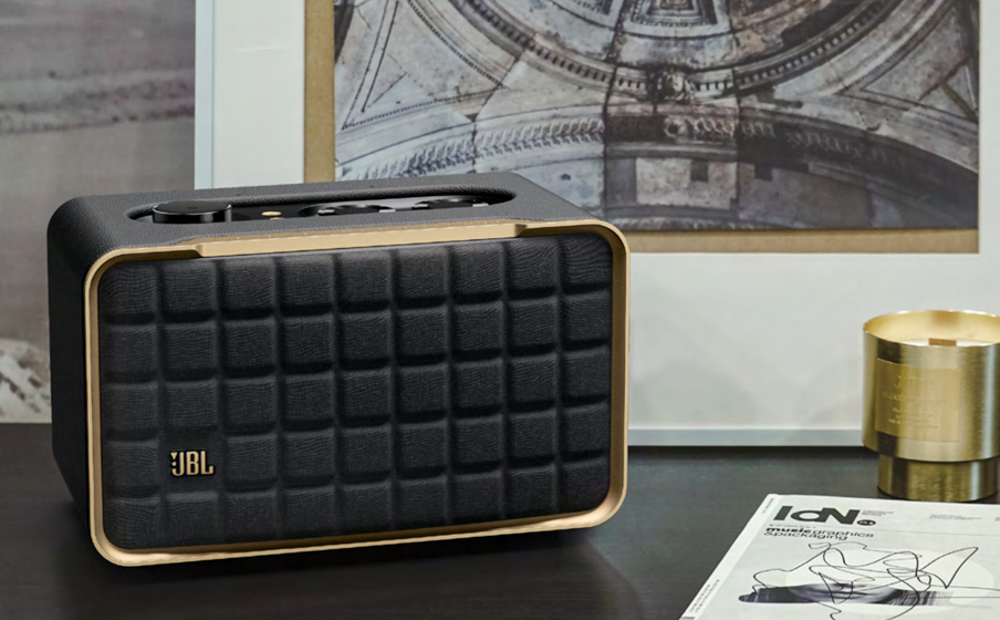 JBL Authentics 200 的靈感來自經典 JBL 傳統設計,精緻的外觀能融入房間的典雅擺設,並且在任 何空間(無論大小)充滿卓越的 JBL 音效。喇叭的頂級鋁製框架、客製化的皮革外殼和重新設計的 Quadrex 格柵,真正展現了我們對每個視覺細節的用心,也恰好是向下發聲被動散熱器周圍的 JBL 經典圖案。