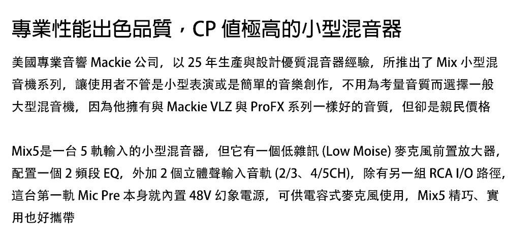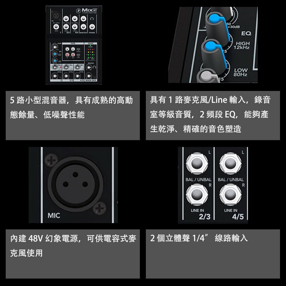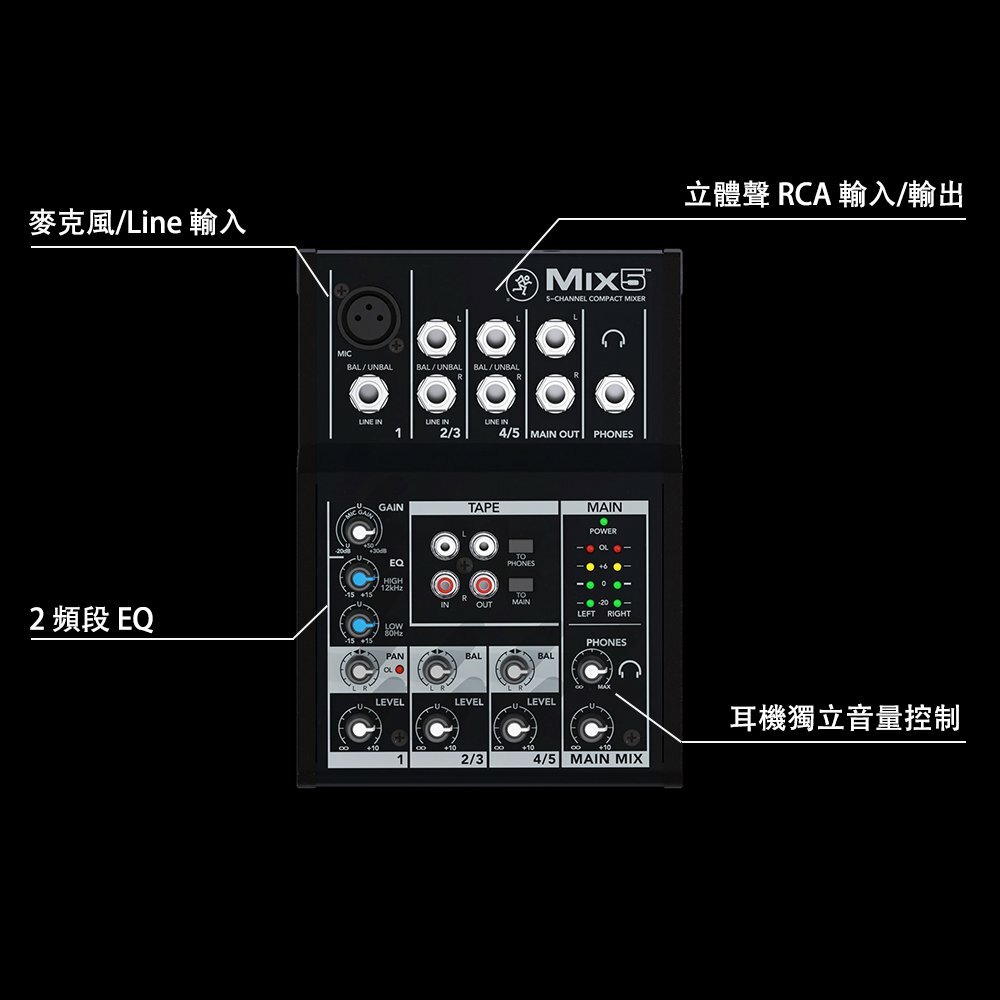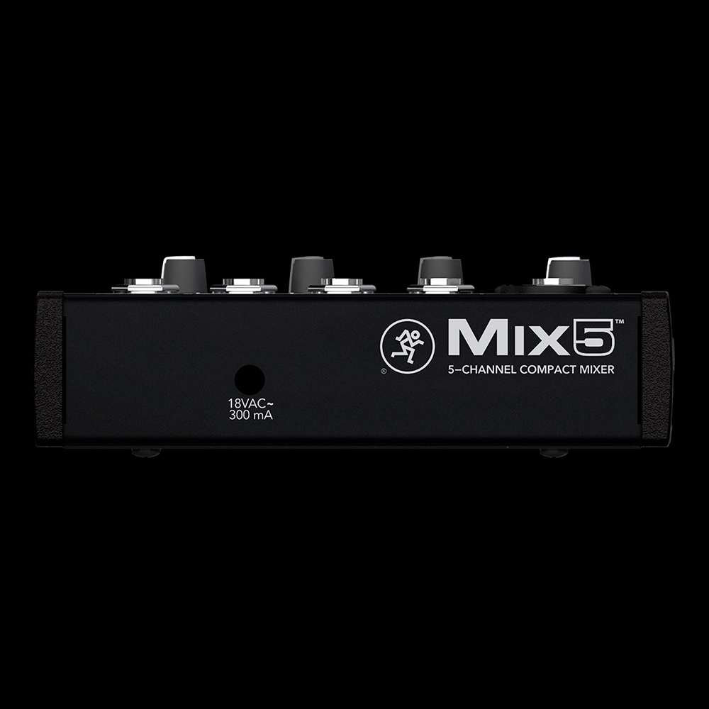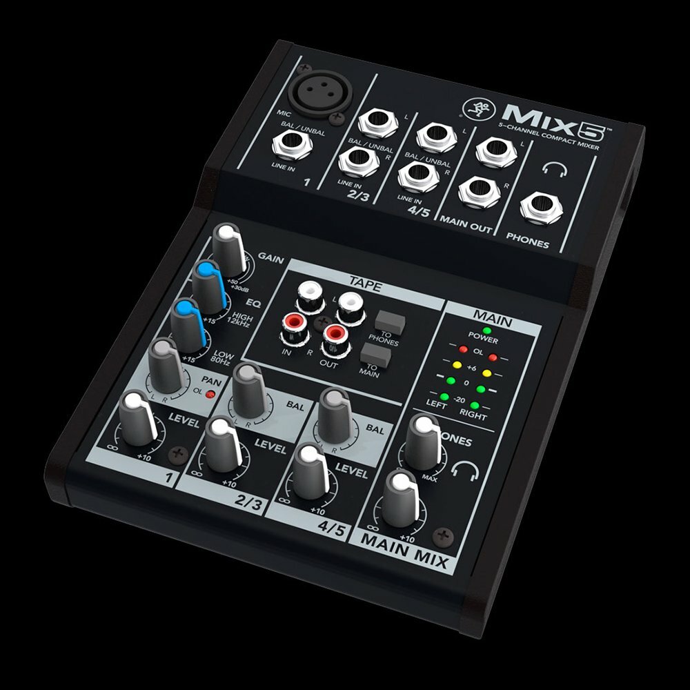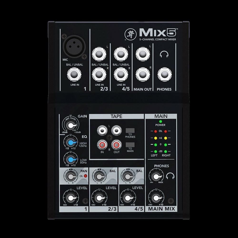 This compact 5-channel mixer features a mic/line input with 2-band EQ, built-in 48V phantom power, two stereo 1/4” line inputs, and stereo RCA input/output. It offers a headphone output with independent volume control and boasts a durable, portable design.