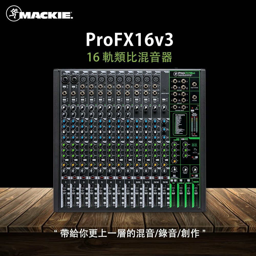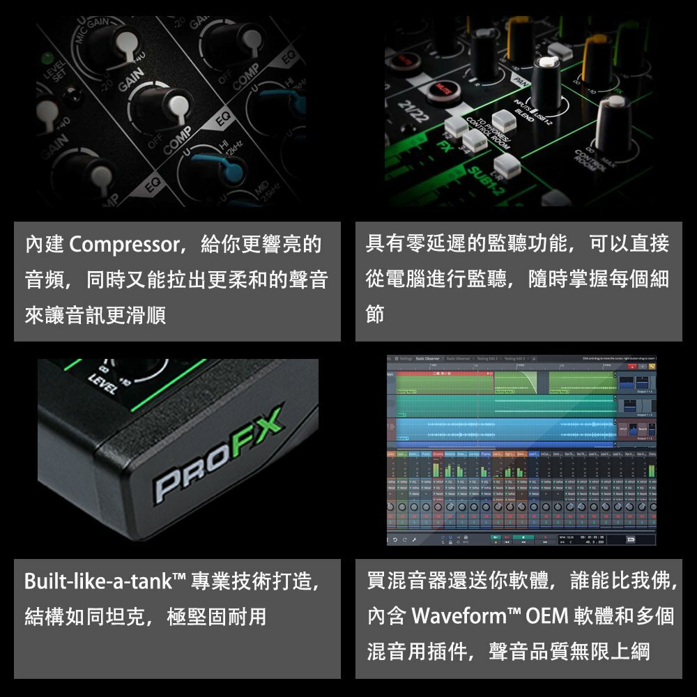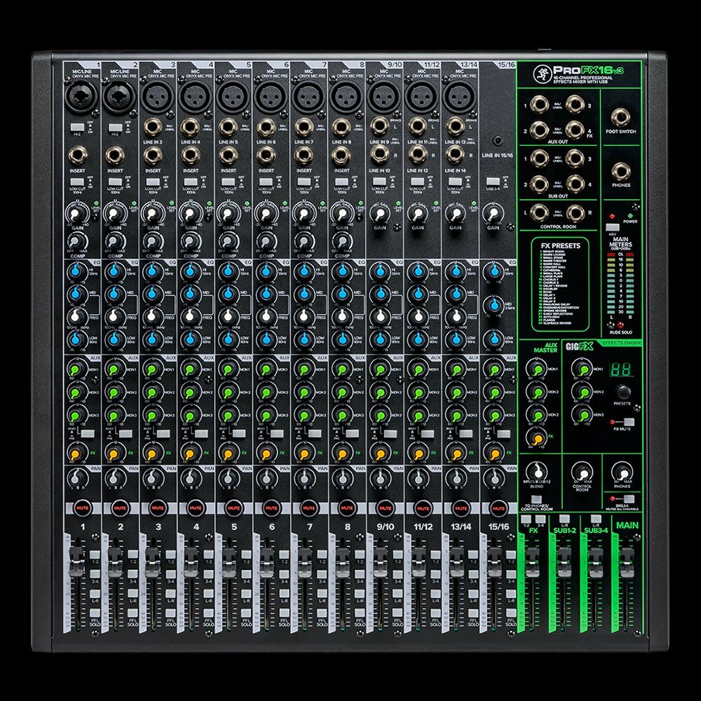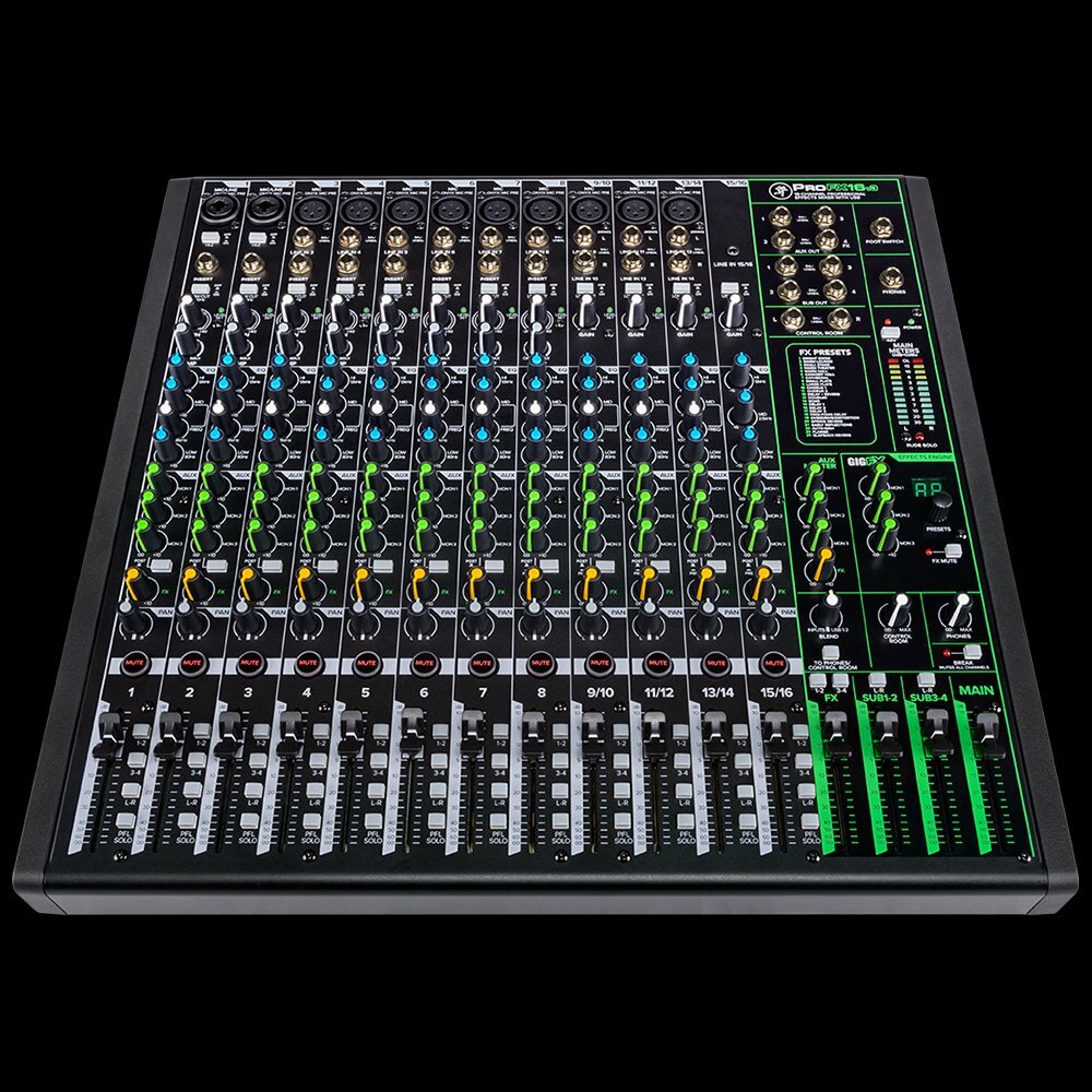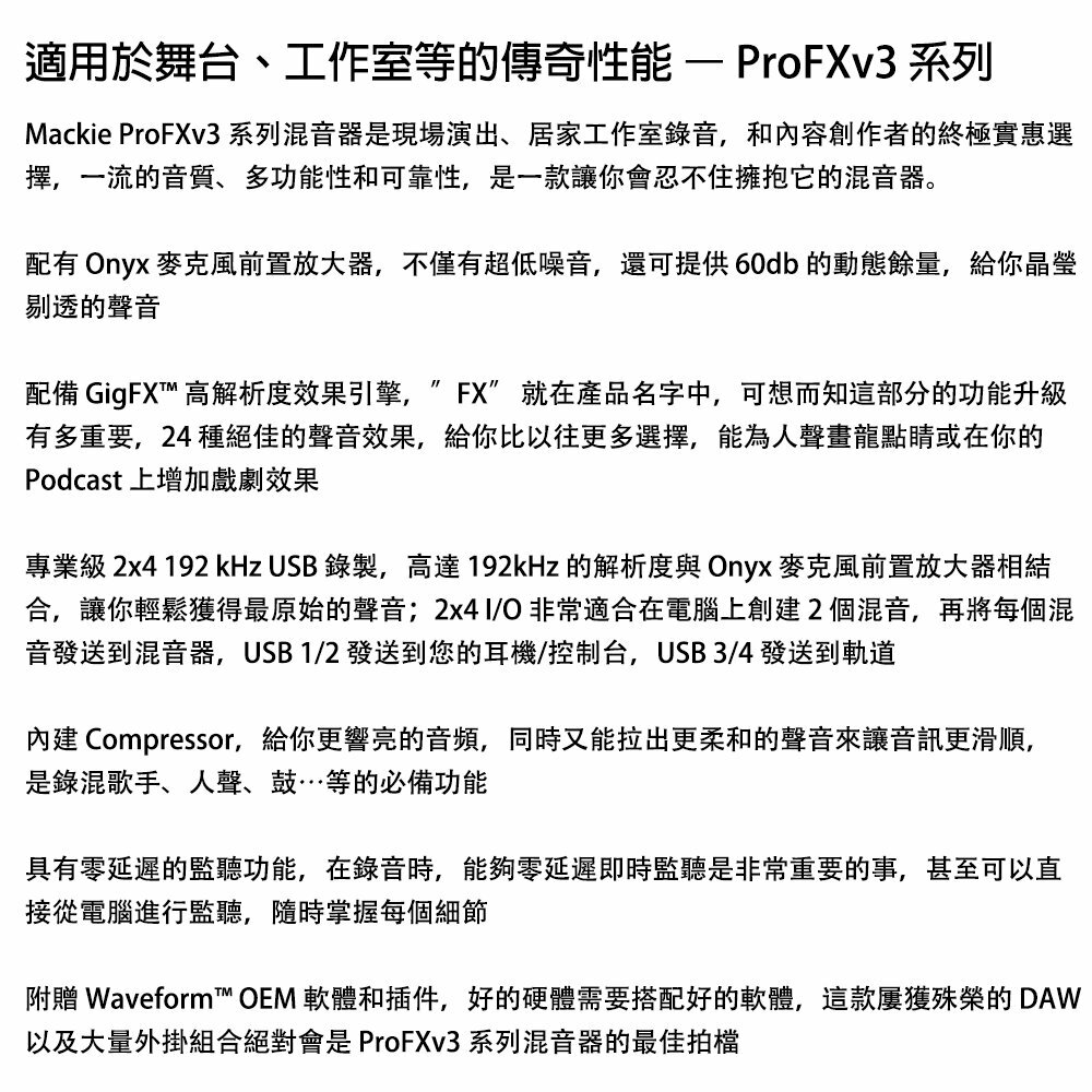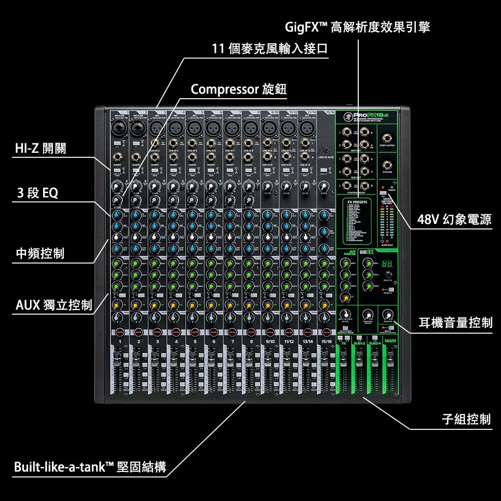 This product features an Onyx mic preamp, GigFX high-resolution effects engine, professional 2×4 192 kHz USB recording, and allows computer-created mixes to be sent back to the mixer. It includes a built-in compressor, zero-latency monitoring, rugged construction, and comes with