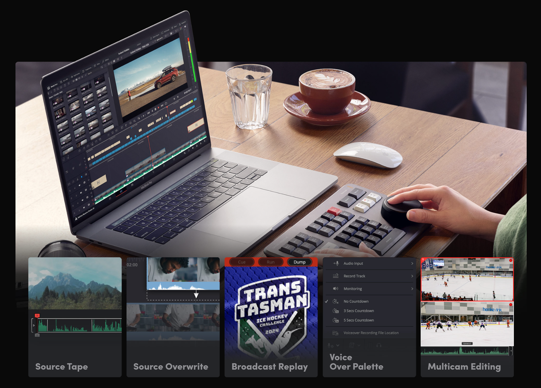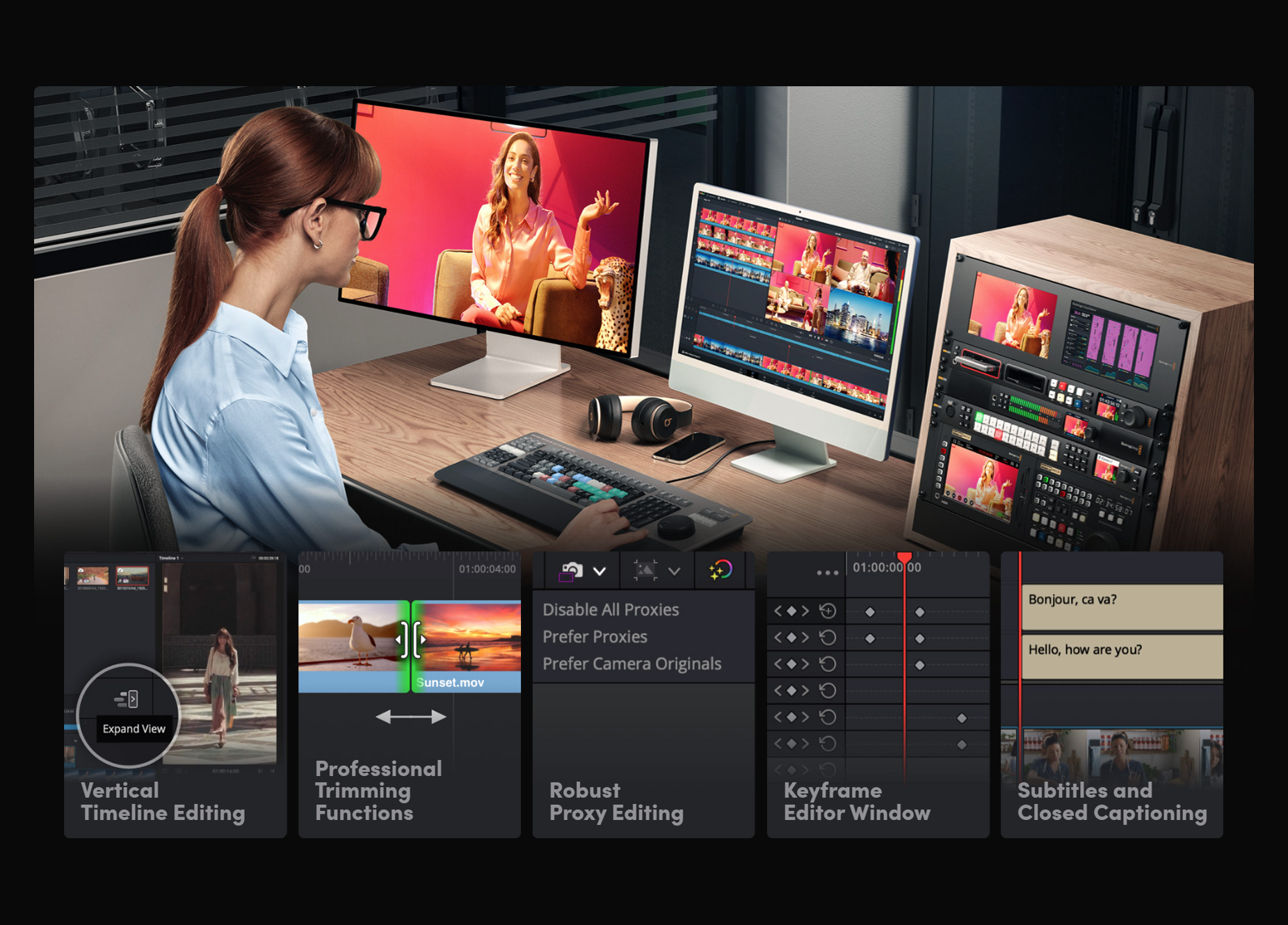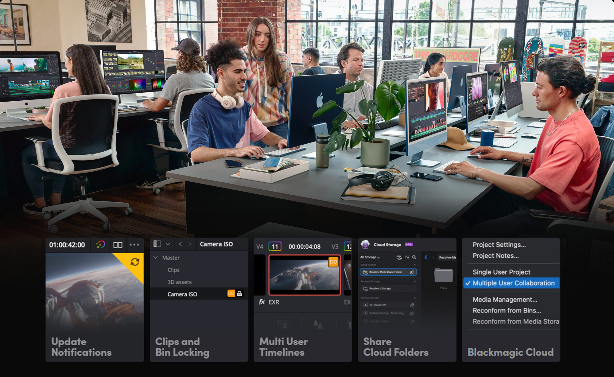 DaVinci Resolve 是唯一支援「多人同步協作」的專業後製平台。專案資料庫支援本地與遠端即時編輯,透過 Blackmagic Cloud,隨時隨地都能存取專案與媒體。你可與剪輯、調色、視效與音訊人員同時作業,無需反覆匯入、轉檔或處理版本問題,是目前全球唯一真正實現同步編輯的解決方案。
