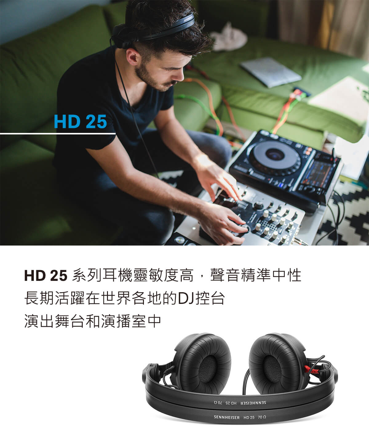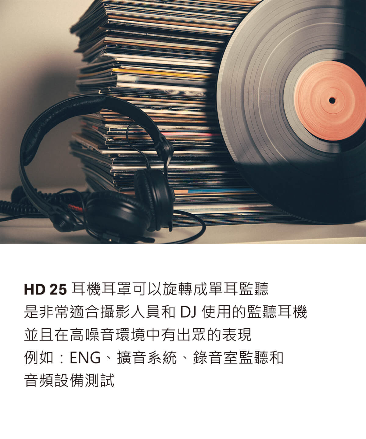 HD 25 系列耳機靈敏度高,聲音精準中性,有絕佳的隔音效果,用料扎實非常耐用,可單耳監聽使用,長期活躍在世界各地的 DJ 控台、演出舞台和演播室中。