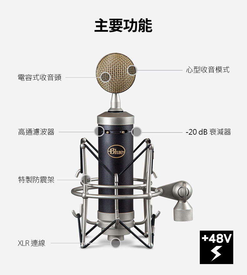 BLUE於1995年成立於南加州,以顛覆傳統的聲學工藝,打造頂尖音質且外型獨特的麥克風,獲得樂壇巨星 Bruno Mars 、ColdplaySting、Maroon5、張學友等採用。不僅多次獲得世界知名音樂設備MIPA、TEC大獎,更順應樂壇運用蘋果電腦錄音的趨勢研發史上首支USB錄音室級麥克風,應用於網路演唱、樂器錄音,配音與遠距會議等。成為歐美最受推崇的USB麥克風,奠定了BLUE在聲音工程中無可撼動的地位。