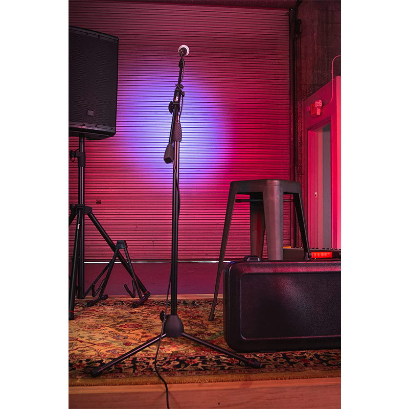 This product has an adjustable telescopic boom with a non-slip rubber handle for easy height and angle adjustments, made from lightweight, durable steel. The foldable tripod base features detachable red safety rings for low-light visibility, and a movable cable clip ensures neat