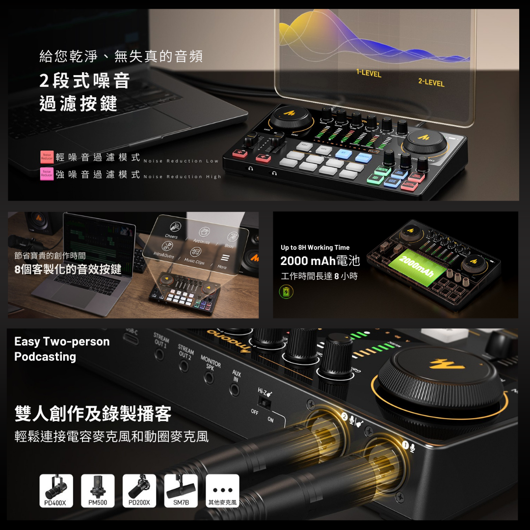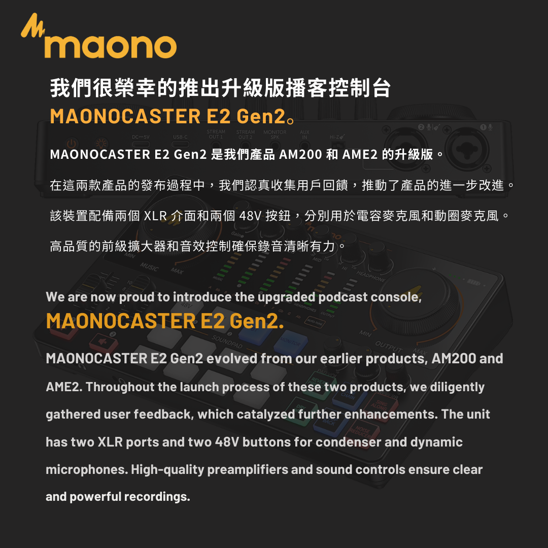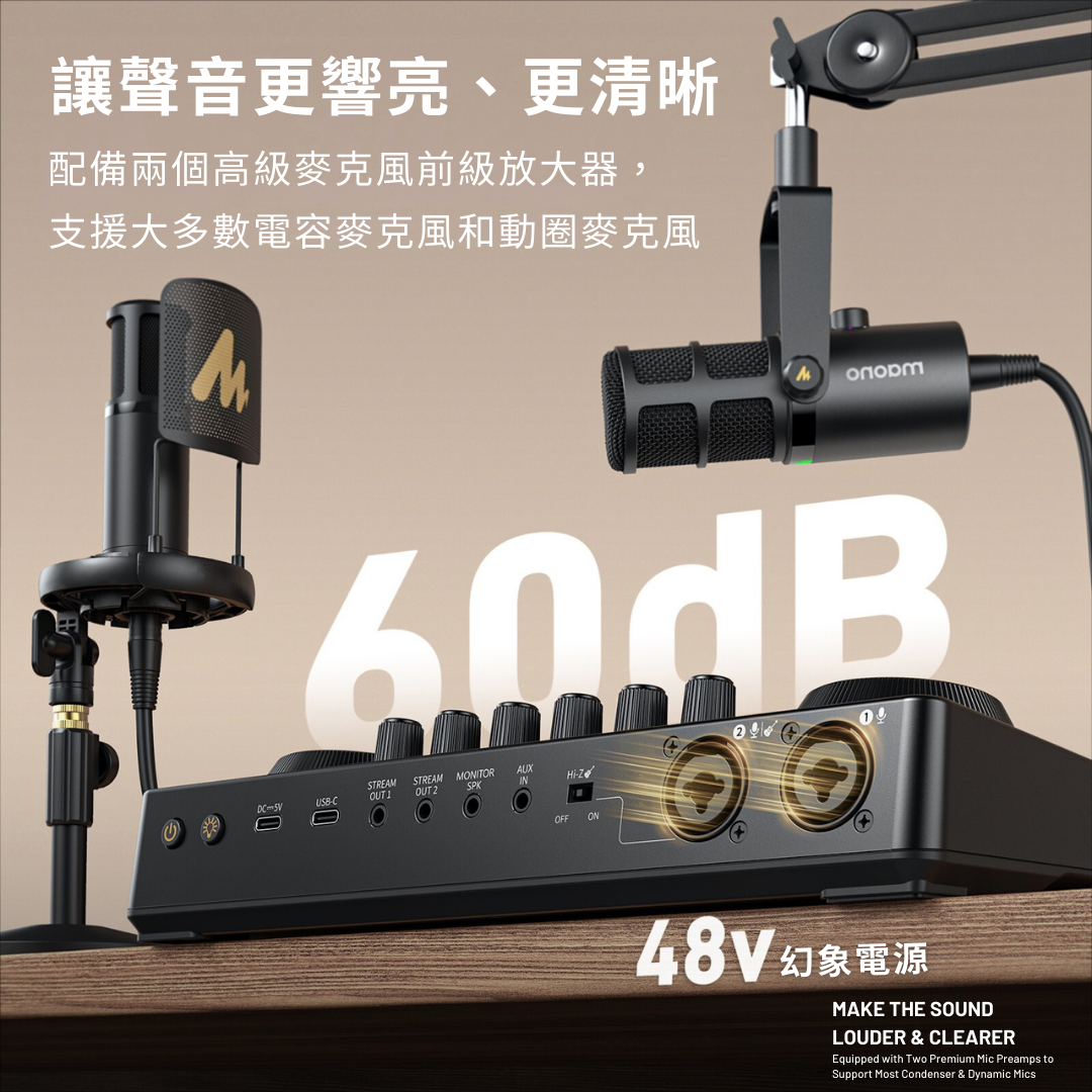 MAONO AME2 Gen 2 是為內容創作、Podcast與居家錄音打造的 USB 音訊介面,主打穩定連線、清晰收音與直覺操控。具備多平台相容性與實用監聽功能,協助你快速完成語音、樂器與會議等多種場景的錄製與輸出,適合新手入門到進階創作者。