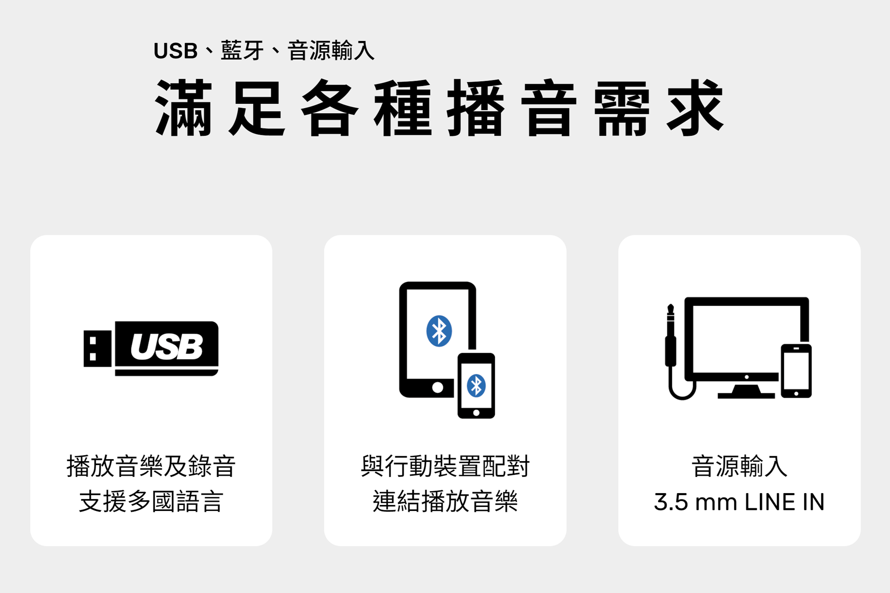 | 播音模組 | 抽取式藍牙模組及USB錄放音座 |