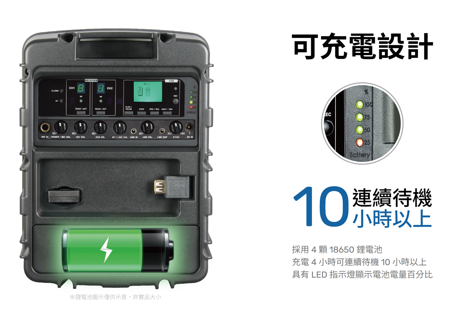 | 充電電池 | 18650鋰離子電池 × 4 (MB-14) |