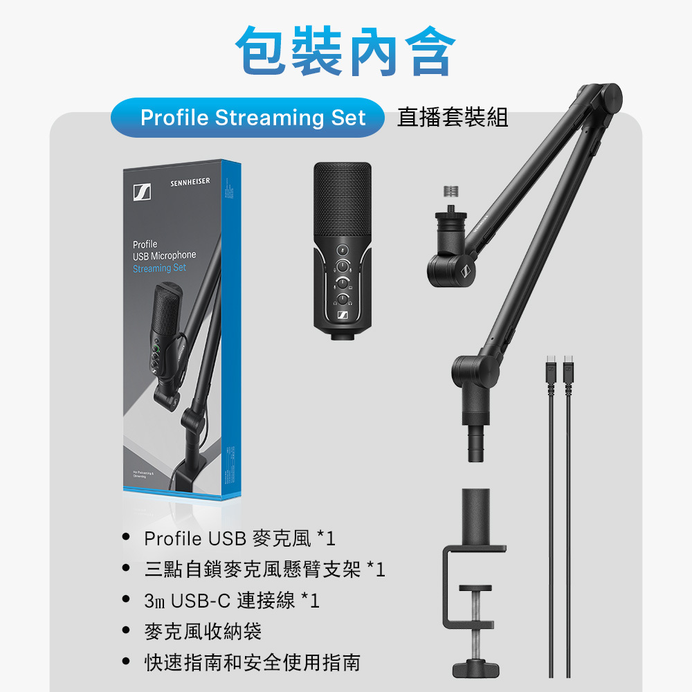 | Proflie Streaming Set 配件 | 麥克風、懸臂式支架(附電纜管理)、3米USB-C電纜和麥克風收納袋 |