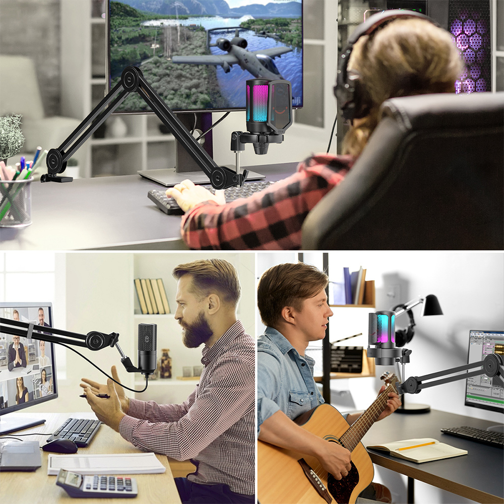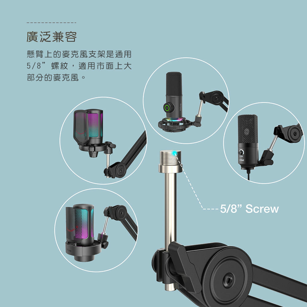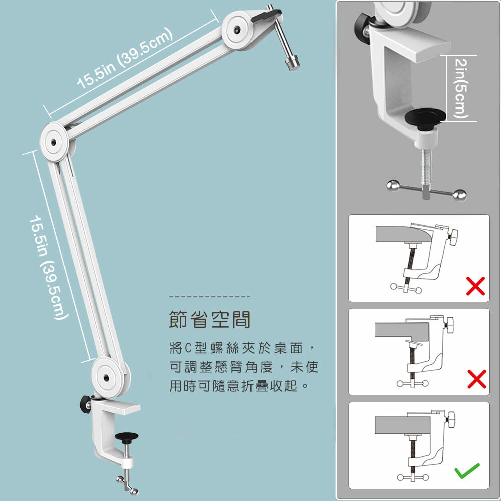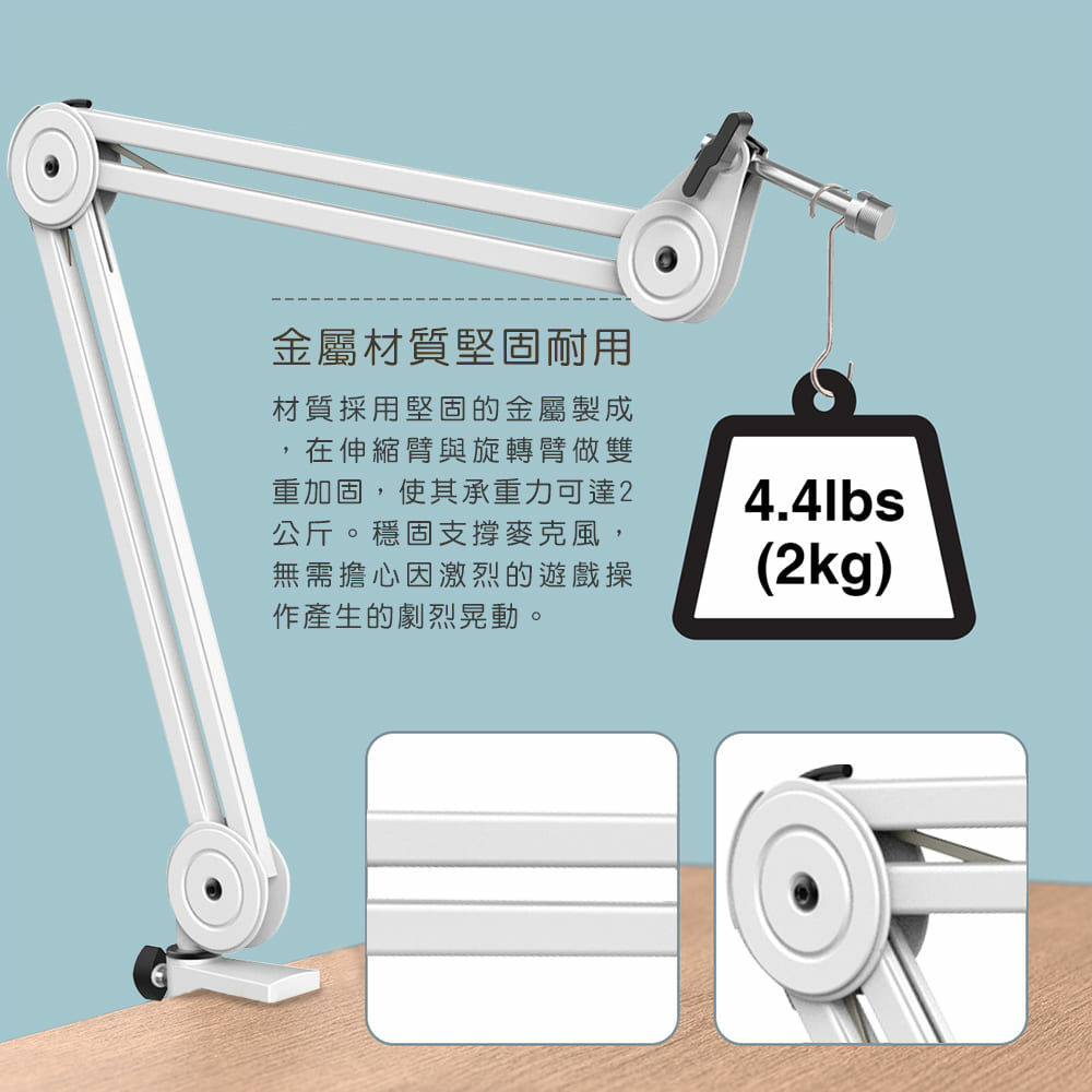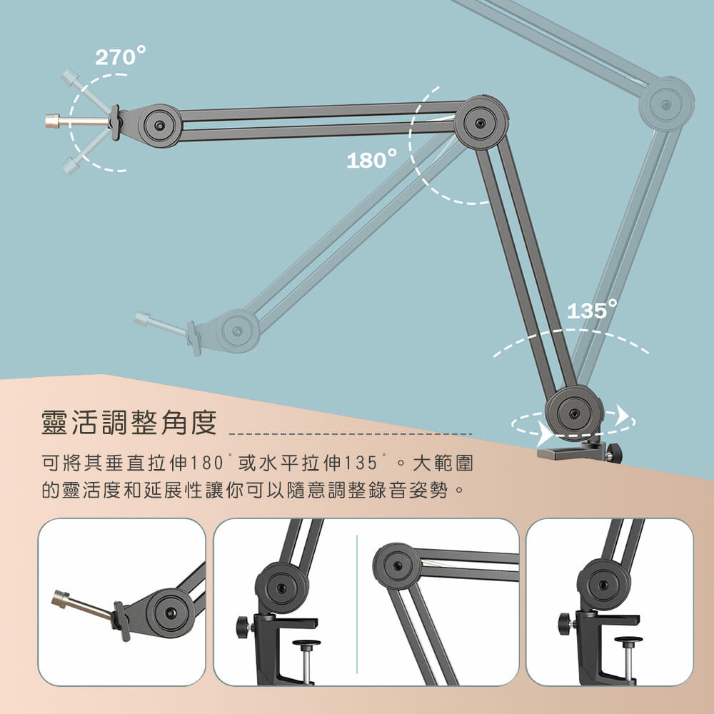 .懸臂式設計:懸臂式支架能夠將麥克風懸掛在桌面上方,避免桌面振動和觸碰噪聲,減少噪音干擾,提高錄音品質。