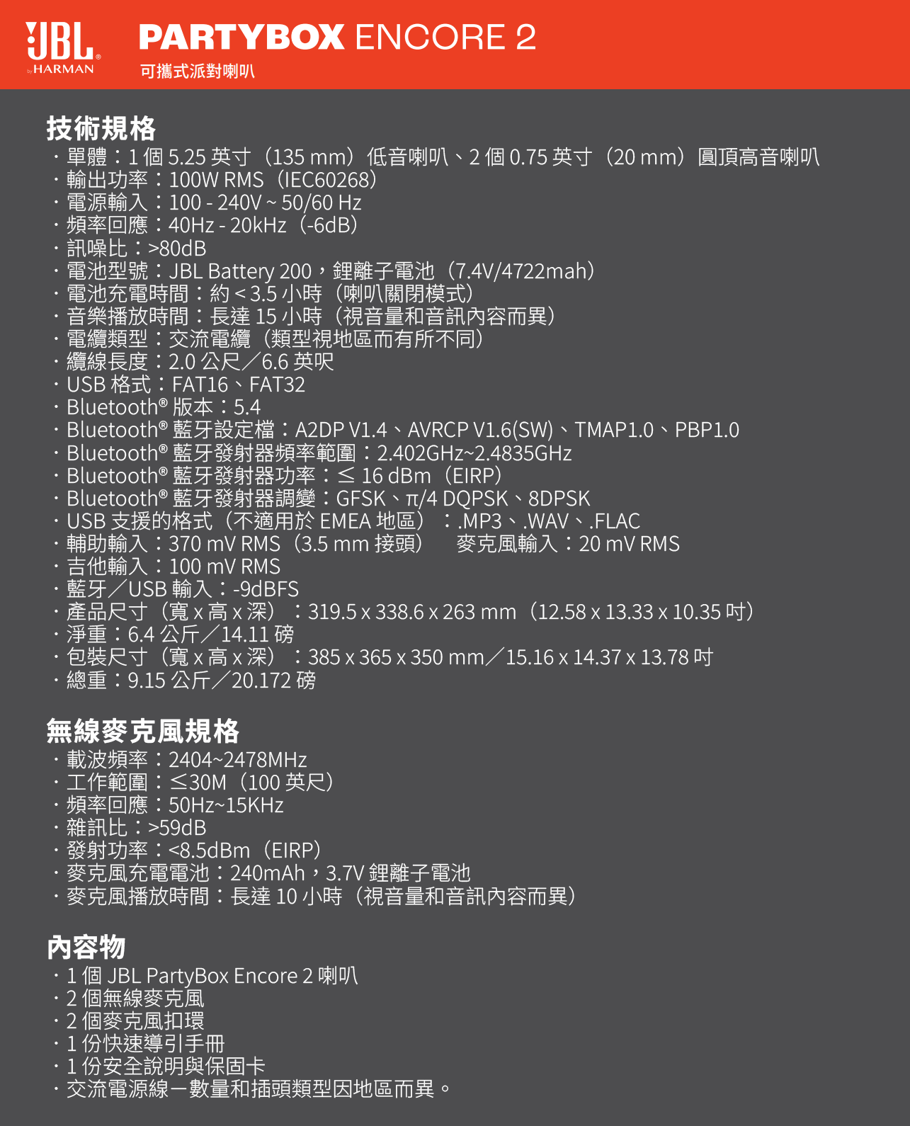啟動 JBL PartyBox Encore 2,讓歡樂時光盡情延續。一開機就把你變成派對 DJ:JBL Pro Sound 搭配節奏燈光,附數位無線麥克風,唱 K/主持都到位。面板可調回音、低音、高音;便攜把手與 IPX4 防潑水,從屋頂到地下室都能開唱。支援兩台配對真立體聲或與 Auracast™ 喇叭串聯;最長 15 小時續航、可更換電池,搭配 PartyBox App 輕鬆控音樂與燈光。