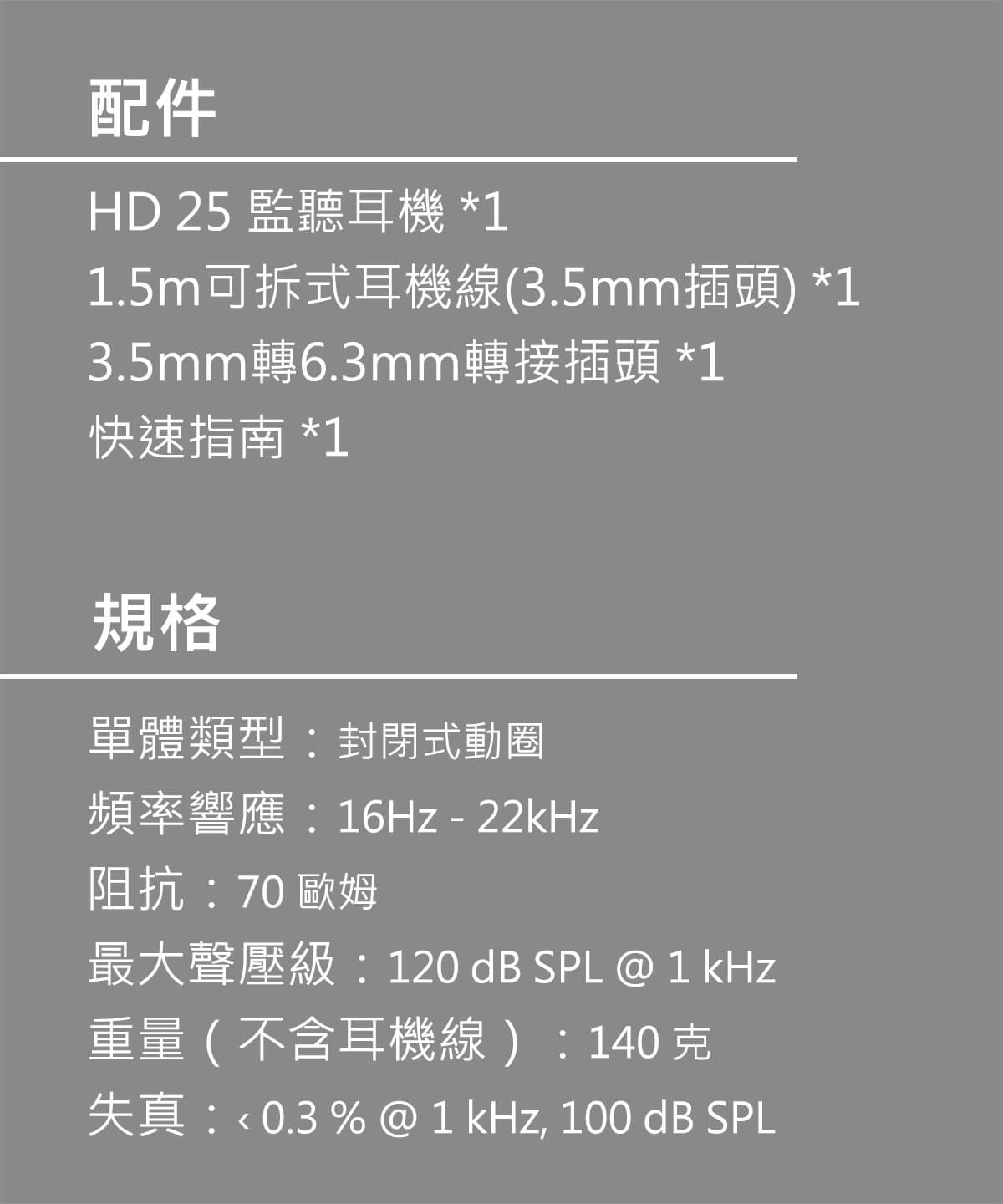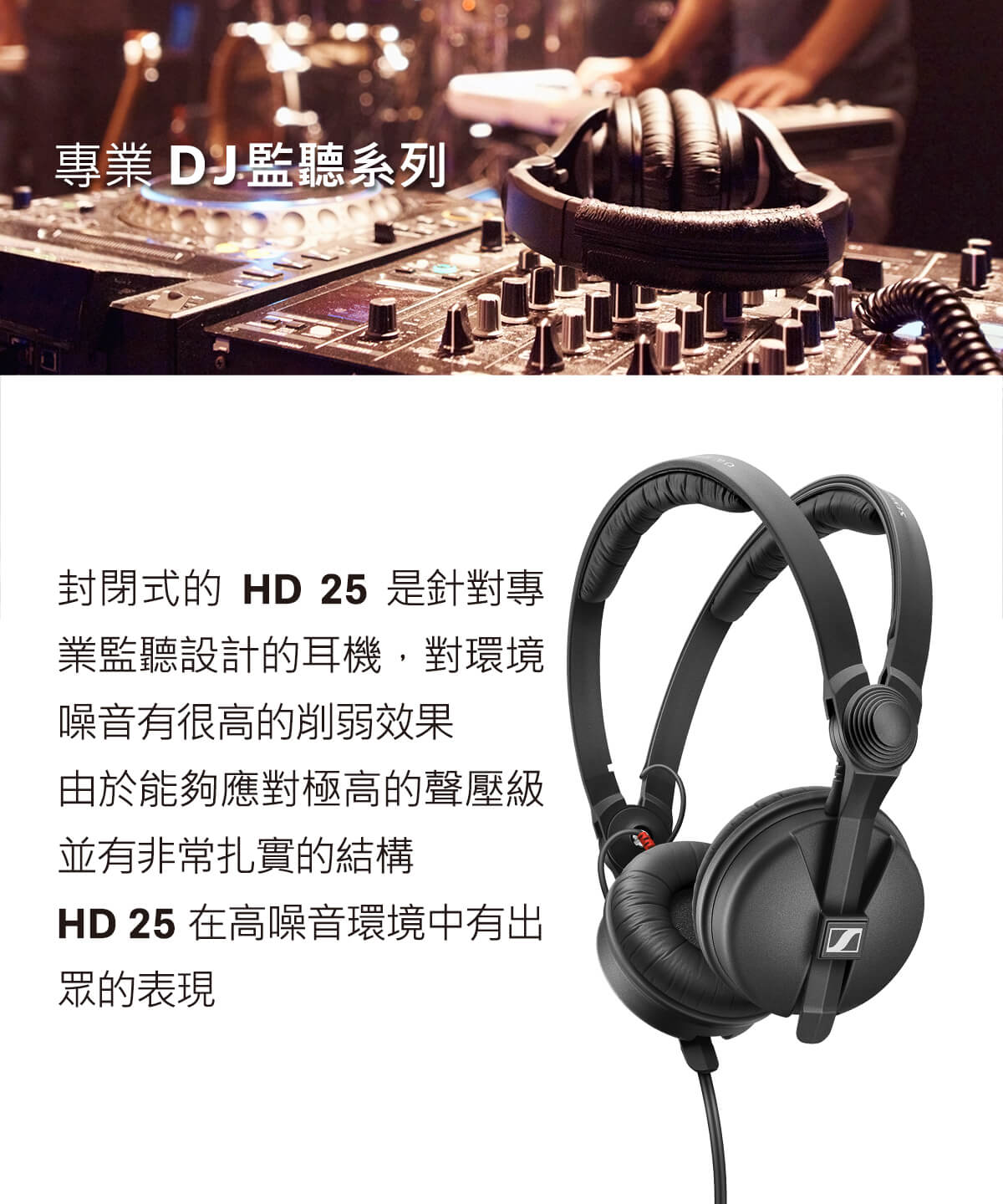 HD 25 系列耳機靈敏度高,聲音精準中性,有絕佳的隔音效果,用料扎實非常耐用,可單耳監聽使用,長期活躍在世界各地的 DJ 控台、演出舞台和演播室中。