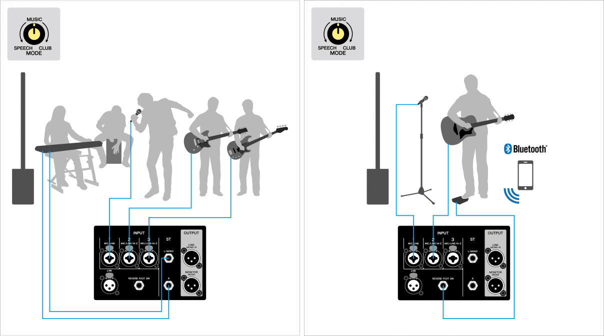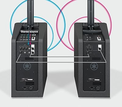 將兩組 STAGEPAS 1K mkII 或一組 STAGEPAS 1K mkII 與一台 DXL1K 連接起來,提供更大的覆蓋範圍和更高的輸出功率,以用於大型演出。支援立體聲和單聲道播放,而且設為單聲道時,仍然可使用兩個連結單元 (*) 的輸入。